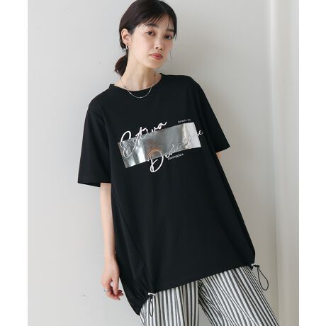BOX箔に隠れたエンボスロゴが大人カジュアルなロゴチュニック。裾はストッパーで調節が出来るデザインで、気になる腰回りカバーの1枚です。落ち感のある生地を使用し、着心地も良くサラッとしていてこれからの季節にぴったり。箔プリントのシャイニー感はアクセサリーの色も合わせるとコーデがまとまります。