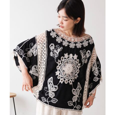上品さと女性らしさがたっぷり詰まった繊細レースで、こなれ見えするトップス。ゆったりとしたシルエットは体型カバーをしてくれて、コンパクトな丈感はボトムを選ばず合わせやすいです。袖は肘が隠れるくらいあるのに、ドルマン袖で動きやすく着心地が涼しいのも嬉しいポイント。