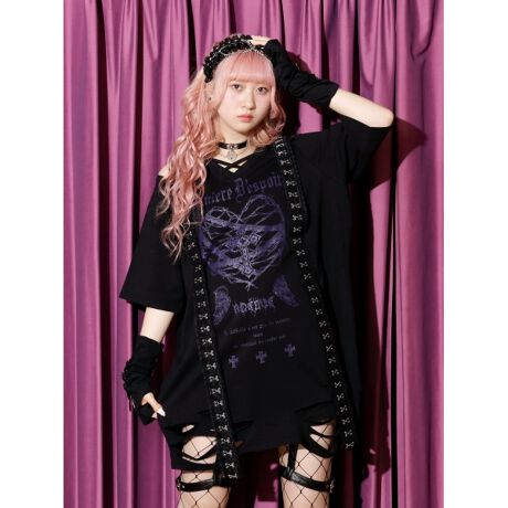 レースホックのラインとハートグラフィックがクールな表情を演出するTシャツ。