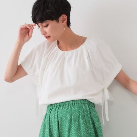 ・衿ぐりと袖口のギャザーデザインをポイントにしたデザインカットソー。