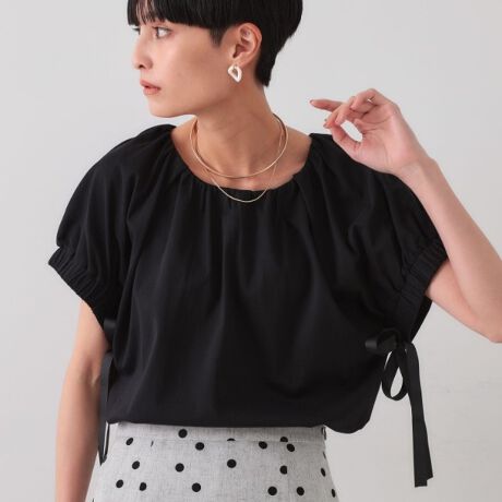 ・袖下にはマットなサテンリボンをアクセントに付け、絞れる仕様とデザインがポイント。