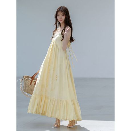 さらっとした肌触りとナチュラルな風合いが特徴のインド産コットン混生地に繊細な刺繍をたっぷりとあしらったふんわりロマンティックな雰囲気のマキシ丈ワンピースが到着。V開きの胸元には繊細なレースディテールを加えた女性らしいデザインで、可憐でフェミニンな印象に。背中は大胆に開け、バックリボンデザインでヘルシーな肌見せが叶います。ゆったりとしたサイジングですが、トップ部分は切り替えとギャザー仕様で美シルエットを作り、背中側はゴムを入れているので自然にフィットし、リラックスしながらもスタイルアップ効果も抜群。調節可能な細めのストラップがデコルテ周りに華奢な印象を与え、軽やかに揺れるスカート部分は歩くたびにエアリーな動きを演出します。リゾートスタイルにもおすすめです。