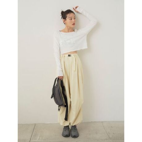 膝下にタックデザインと、裾のドロストを絞ってボリュームあるフォルムが作れる動きのあるシルエットが特徴のカーゴパンツ。