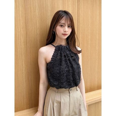 キラキラとしたラメ糸を織り交ぜた、毛足のあるツイード調の軽やかなシアー生地と、レースを組み合わせた、ロマンティックな雰囲気のホルターカットプルオーバーです。首元と袖周りにはアイレット刺繍のレースフリルをあしらい、顔まわりを愛らしく華やかに演出。ホルターカットデザインで、モードに仕上げました。背中側にはシフォンのボウタイリボンを添えて、可憐さと品格をプラスしています。特別な日のドレスアップシーンにも、カジュアルな日のデニム合わせにも活躍する1枚で主役級のトップスです。