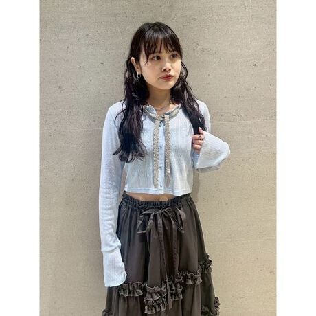 ハリ抜きのカットソー素材を使用したクロップドカーディガン。シンプルさを保ちながら袖に切り替えを入れ、襟ぐりにはピコレースを施すことで女性らしさもプラスしました。フロントボタンにはキュートなハート型ボタンを採用し、ガーリーな雰囲気も忘れずに。
