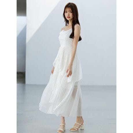 <b>【トレンド感のあるアシンメトリーティアードデザインと胸元のドレープ使いが華やかなキャミワンピース】</b>