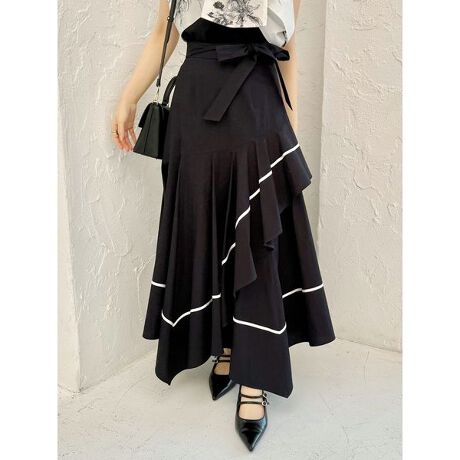 ハンカチのようにひらひらと舞うユニークなヘムラインが特徴のエレガントなコットンスカートです。軽やかな素材感が動きに合わせてふんわり揺れ、女性らしさを引き立てます。ウエストは取り外しのできる長めのリボン仕様で調整が可能。体型に合わせた快適なフィット感を実現します。リボン結びや、ひとつ結びで垂らしても可愛いです。裾部分には配色のテープが施され、ベーシックカラーながら目を惹くアクセントに。カジュアルからフォーマルまで幅広く対応し、あらゆるシーンで活躍するロング丈スカートです。裏地も付いています。