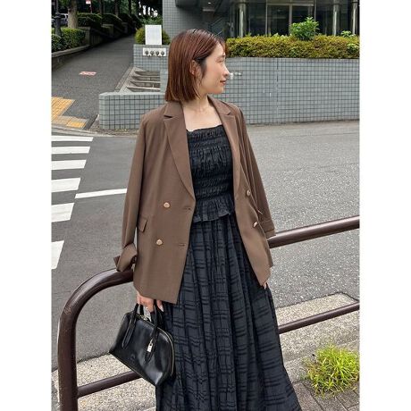 前見頃の合わを浅めに設計して女性らしい抜け感を加えた、ダブルデザインのベーシックジャケットがお目見え。ハンサムな雰囲気に、ゴールドメタルボタンがシンプルなフォルムに華やかさをプラスし、装いに品格を与えます。ウエスト部分にはダーツを取り、ややコンパクトなシルエットに仕上げているのでスタイルアップ効果も抜群です。程よい着丈で、パンツはもちろん、スカートやワンピースにも合わせやすい万能ジャケットです。手洗いできる素材を使用しており、機能性も抜群。フラップ付きのポケットが付いています。抜け感のあるティアードニットキャミワンピース(SWNO254068)合わせもおすすめです。