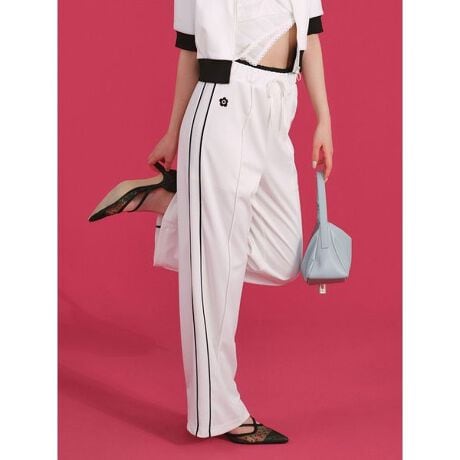 ウエストのレイヤードデザインが特徴的なトラックパンツ。ぐるっとゴム仕様で楽に履けるのに、シルエットは膝周りがすっきりとしており、裾に向かって広がるセミフレアがカジュアルになりすぎずスタイルアップ効果も期待できます。太もも部分にはさりげなくデイジーの刺繍を施し、コラボレーションならではのアクセントをプラス。フェミニンなトップスとの相性が抜群で、トラックジャケット(品番LWCJ254011)とあわせるセットアップもおすすめです。