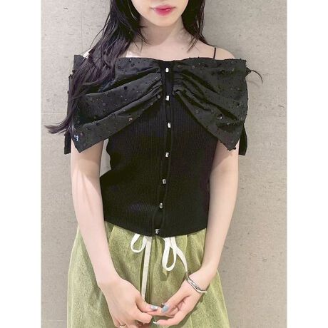 キラキラと輝くスパンコールとビーズ刺繍を施したリボンが目を惹く、エレガントなニットトップス。リボンの華やかさを程よく引き締めるフロントのホックデザインが甘すぎず、大人のカジュアルスタイルにもマッチします。肩の紐は取り外し可能なので、オフショルダーとしても楽しめる2Way仕様。デニムやワイドパンツと合わせてカジュアルダウンしたり、スカートでフェミニンに仕上げたりと、コーディネートの幅が広がる一枚です。