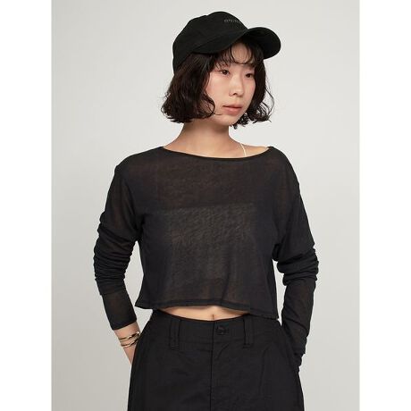 程よい透け感とクロップド丈で、ヘルシーに着こなせるトップス。ストレッチ性抜群でコットン素材特有のさらりとした心地よい肌ざわりも魅力の一つのトップス。