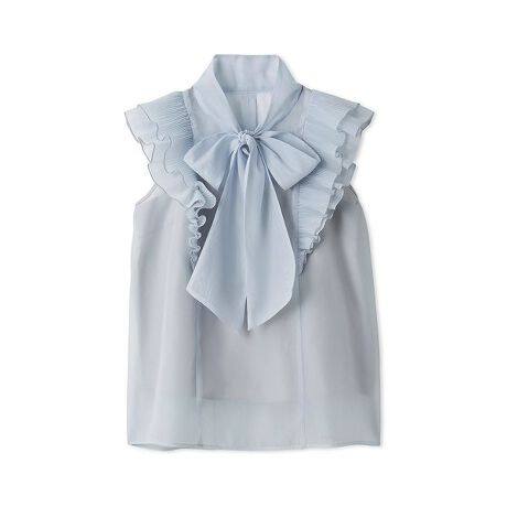 程よいシアー感とふんわり感が上品で優しい印象のボウタイノースリーブトップスです。プリーツを加えたオーガンジー生地と滑らかなオーガンジー生地を組み合わせた肩周りのフリルが顔まわりを華やかに彩ります。胸元のふんわりとした大ぶりリボンも加わって、クラシカルな印象に。フリル位置は、肩が広く見えないようこだわって配置しているので、すっきりとエレガントにご着用いただけます。リボンを解き、被りでの着脱が可能。キャミインナー付きなので、安心です。シンプルショートパンツ(SWFP254057)合わせもおすすめです。