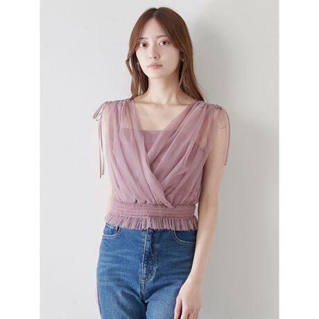 さらりとした着心地のカットソーキャミソールに、シアーで柔らかなチュールをカシュクール風にレイヤードしてドレッシーに仕上げた、チュールレイヤードカシュクールカットプルオーバーです。ショルダー部分はドロストデザインを加えてレディな印象に。艶感のあるチュールにドレープ感が加わって顔まわりがぱっと華やかに。ウエスト部分はゴムシャーリングを入れてフィット感を出し、着心地の良さを叶えながらもスタイルアップ効果も抜群です。カジュアルなボトムにもキレイめなスカートにも、様々なコーディネートに取り合わせやすいデザインに仕上がりました。インのキャミソールの肩紐はアジャスタ付きなので調節が可能です。