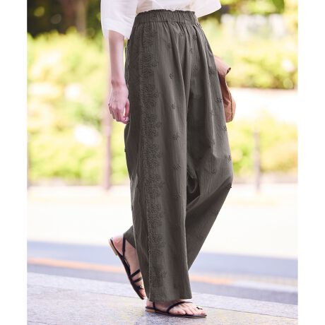 ・脇に入ったレースのスカラップ柄がポイントのワイドパンツ。