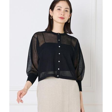 ■デザイン清涼感があり軽やかに仕上げた透け感のあるニットカーディガン。タックを施し立体感のあるお袖にしており、カーデとしてはもちろん、ボタンを留めてプルオーバーとして着るのもおすすめ。フロントのグログランテープ使いがアクセントになり、シンプルですっきりとした印象で、シアー感がニュアンスのある雰囲気を演出します。■素材ビスコースをベースにポリエステルを撚糸させた細番手の糸は、張り感があり程よいしなやかさを演出します。軽く通気性も良いのが特徴で、ツルっとした表面感は、すっきりしていて上品な光沢も兼ね備えています。・水洗い可■サンプル撮影商品こちらの商品はサンプルでの撮影となっております。実際の商品とは、サイズや色味、素材、デザイン等の仕様が若干変更になる場合がございます。