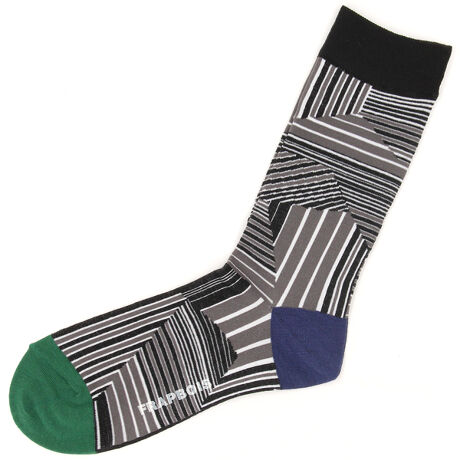 【素材】肌触りか良く発色の良い糸を使って様々なストライプ柄を表現しています。【デザイン】パッチワークした様なデザインに様々なストライプ柄を組み込んで不思議な柄に仕上げたソックスはインパクトが有りコーディネートのアクセント抜群のアイテム。つま先とかかとの配色などさりげないアクセントが◎。*こちらの商品はユニセックス商品です。Fサイズ:24〜27cm【ブランド情報】FRAPBOIS/フラボア2001年にブランドスタート。「大人げない大人の服」をコンセプトに、大人が着るリラックスしたデイリーウェアを提案するコレクションブランド。レディースとメンズのアイテムをご用意しています。