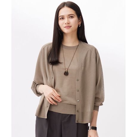 冷房対策にぴったりの華やかなシアーカーディガン■デザイン繊細な煌めきとシアー感が華やかなトレンド感のあるカーディガンです。気温が高くなるにつれて単調になりがちなスタイリングに、きらりと輝くアクセントとして取り入れて頂けます。室内の涼しい気温にもお使いいただけます。様々なボトムスと合わせやすい使いやすい着丈となっております。■素材程よいハリコシと心地よい清涼感、ブライト糸ならではの繊細な煌めきのある表情が華やかな素材です。暑い夏にも着て頂きやすいシアー感のある素材になっております。■同素材アイテムプルオーバーニット(KRWRGA0052)