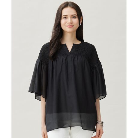 スモッキング刺繍が華やかなスキッパーブラウス■デザイン胸元と肩周りにスモッキング刺繍を施したブラウスです。ひらりとボリューム感のある袖が華やかな印象で、襟元はスキッパー開きで抜け感があり、すっきりと着て頂けます。腰周りが隠れる長さで、1枚で着映えするアイテムです。■素材シルク混特有の光沢感ときしみ感があり、上品な透け感のある素材です。細番手原料のため軽やかでしなやかな風合いで、発色の良さもポイントです。■同素材アイテムフレンチスリーブブラウス(BLWMGA0001)