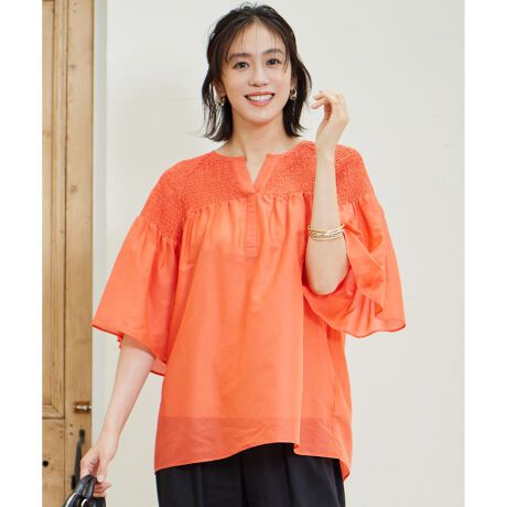 スモッキング刺繍が華やかなスキッパーブラウス■デザイン胸元と肩周りにスモッキング刺繍を施したブラウスです。ひらりとボリューム感のある袖が華やかな印象で、襟元はスキッパー開きで抜け感があり、すっきりと着て頂けます。腰周りが隠れる長さで、1枚で着映えするアイテムです。■素材シルク混特有の光沢感ときしみ感があり、上品な透け感のある素材です。細番手原料のため軽やかでしなやかな風合いで、発色の良さもポイントです。■同素材アイテムフレンチスリーブブラウス(BLWMGA0001)