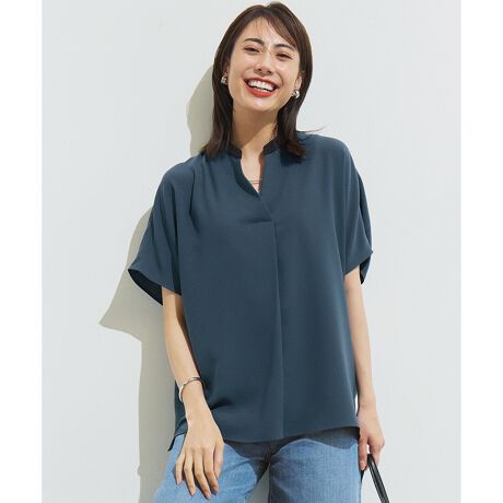 襟もとの開いたスキッパーディテールとバンドカラーがポイントのカットソー。顔回りがすっきり見える襟回りのデザインで、お仕事にもカジュアルにも活躍します。オフィスや華やぎの場所にも同素材のテーパードパンツやワイドパンツとのセットアップで大人っぽく着こなせ、カジュアルなワイドパンツに合わせてONにも着られます。カラーは、引き締まった印象のブラック(#005)、上品なネイビー(#075)、襟もととのコントラストが映えるベージュ×ブラック(#133)、ニュアンス感のあるダークグリーン×ブラック(#165)の4色展開です。配色づかいの襟は、シンプルな中にも洒落感をプラスしました。