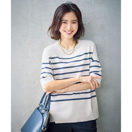 ■デザイン美しいドレープ感のあるキレイめなTシャツライクニットです。程よくゆとりのあるシルエットですが、落ち感のある素材なのでラフな印象になりすぎないデザイン。ジャケットやニットを羽織ってもストレスを感じにくく、ブラウスのようにきちんと感もあるのでインナーとしても最適です。着丈に前後差があるのでパンツスタイルにも合わせやすく、シーンを問わず活躍する汎用性の高いトップスです。■素材レーヨンとストレッチポリエステルを撚糸した糸を使用しております。ストレッチ性があるので動きやすく、身体に馴染みやすいのでストレスフリーな着心地です。撚りを強くかけているので、表面がクレープ状になっており、ドライタッチなシャリ感と清涼感がありながら、エレガントなドレープ性を合わせ持った素材です。接触冷感、UVカット機能付きです。ピンク(012)、ベージュ×ネイビーボーダー(233)、カーキ×オフボーダー(254)カラーのみ、遮熱率43%という機能も付いています。※ブラック(005)カラーの商品については、サイト表記の洗濯表示欄の洗濯表示とは異なり、パークロロエチレン溶剤でのドライクリーニングが可能な表記となっている場合がございます。■同アイテムの他のカラープルオーバー ニット(KRWRCM0452)