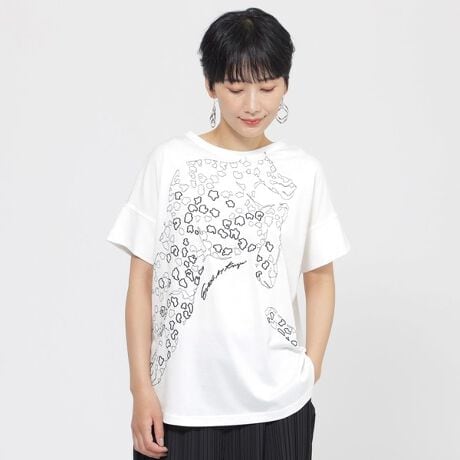 ボートネックのフレンチスリーブTシャツです。レオパード柄を手書き風タッチでグラフィカルに表現しています。大人のカジュアルコーディネートはもちろん、きれいめ目コーディネートなど、幅広いアイテムと相性良く着こなせる汎用性の高いTシャツです。