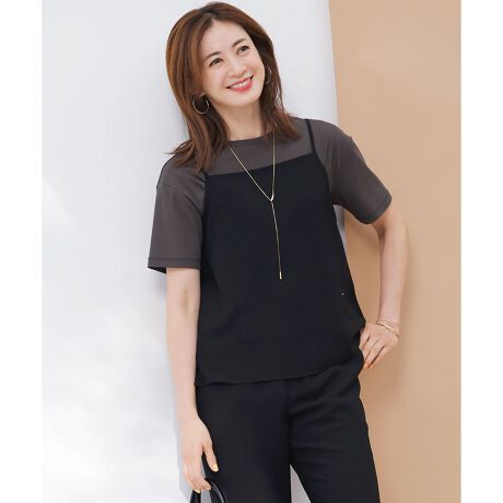 トッピングアイテムとして活躍するキャミソール。華奢な肩ひもはアジャスター付きで調整でき、サイドはファスナーあきの仕様です。適度にゆとりがありつつも、ゆったりしすぎないサイジングに仕上げているので、インナーキャミソールやベーシックなTシャツと合わせてきれい目ながら抜け感のある大人スタイリングが叶います。同素材の<テーパードパンツやワイドパンツとのセットアップでオールインワン風のスタイルもおすすめです。カラーは、引き締まった印象のブラック(#005)、やわらかなベージュ(#033)、上品なネイビー(#075)の3色展開です。