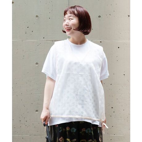 シンプルなドルマンTシャツと透けるドットのベストがお得なセットになりました。