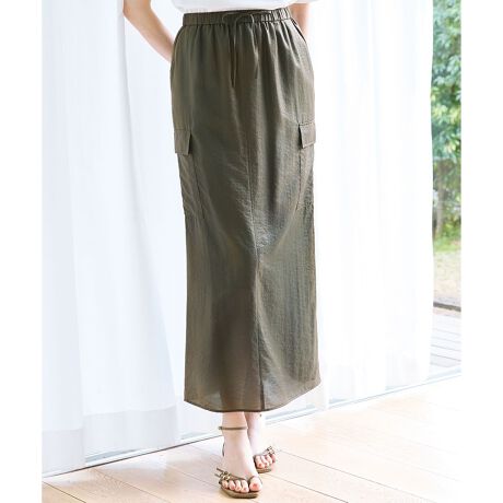 程よいシアー感が今年らしい、リラックス感のあるIラインカーゴスカート。ミリタリーな印象のアウトポケットがポイントです。後ろにはフレア切り替えを入れ、前と後ろで見え方の違うシルエットが新鮮な印象に。膝下位置ぐらいまで(裾から30cm上まで)裏地がついているので、足元だけにほんのり透け感がありつつも、インナーの透けは気にせず安心して着用いただけます。すっきりとしたシルエットなので様々なトップスとの相性が良く、同素材のノースリーブブラウスやタックブラウスと合わせるワンピース風の着こなしもおすすめです。ご自宅での手洗いが可能なのも嬉しいポイント。ニュアンスカラーがお洒落なグレー(#004)、上品なカジュアル感を演出するカーキ(#054)の展開です。