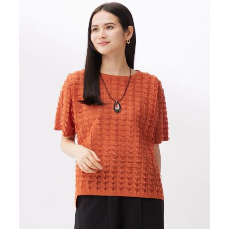 スタイリングのアクセントになるカットジャカードニット■デザイン華やかな印象のカットジャカードニットです。シンプルなTシャツ型にすることで、デイリーに取り入れやすいデザインに仕上げています。程よいシアー感が涼しげで、1枚でスタイリングに華やかさを添えてくれるアイテムです。同素材のスカート(SKW7GA0054)とセットアップとして着て頂くのもおすすめです。■素材シアー感とハリ感のある素材をベースに、コットンポリエステルの糸をカットジャカードでフリンジ調に施した素材です。デザイン性が高いのでインパクトがあり、涼しげで夏らしい素材です。■同素材アイテムスカート(SKW7GA0054)