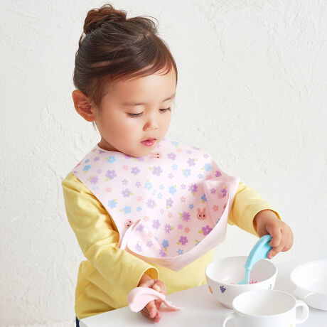 食べこぼしをキャッチできるように、スナップボタンをとめると立体的なポケットが作れ、