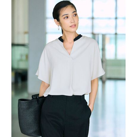 襟もとの開いたスキッパーディテールとバンドカラーがポイントのカットソー。顔回りがすっきり見える襟回りのデザインで、お仕事にもカジュアルにも活躍します。オフィスや華やぎの場所にも同素材のテーパードパンツやワイドパンツとのセットアップで大人っぽく着こなせ、カジュアルなワイドパンツに合わせてONにも着られます。カラーは、引き締まった印象のブラック(#005)、上品なネイビー(#075)、襟もととのコントラストが映えるベージュ×ブラック(#133)、ニュアンス感のあるダークグリーン×ブラック(#165)の4色展開です。配色づかいの襟は、シンプルな中にも洒落感をプラスしました。