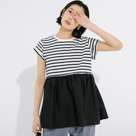 クルーネックのすっきり感に、ギャザーデザインをドッキング。