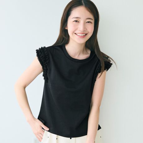 肩まわりにふんわりあしらわれたフリルが、シンプルな中にも華やかさをプラス。