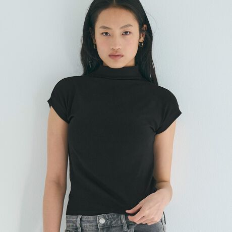 とろみ感と美シルエットが映えるテレコリブハイネックTシャツ