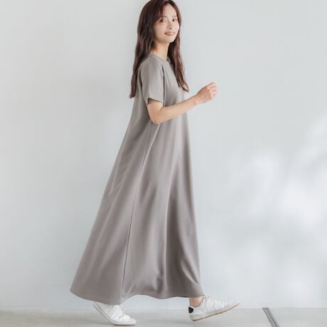 ふんわりとしたシルエットで体のラインを拾わず、1枚で着映えするマキシワンピース。