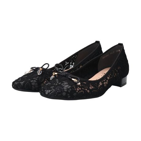 上品で繊細なレース素材のパンプス。スクエアトゥでエレガントになりすぎずデイリーに履いて頂けます。リボン先に付いた透明のハート型チャームも歩くたびにキラキラと揺れ足元を一層華やかに演出します。