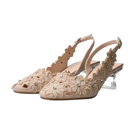 花柄に切り取られた凹凸感のあるラメ生地を使用したブリジットバーキンらしいデザインのバックバンドパンプス。ヒールはオーロラに光るクリアヒールを使用し透明感のある1足に仕上げました。