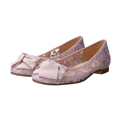 大きめのグログランリボンが大人かわいいフラットパンプス。繊細なレース生地は日本材を使用し上品な雰囲気に仕上げました。透け感のあるチュールを裏材に使用し柔らかく足を包み込み、長時間のおでかけにもぴったりです。