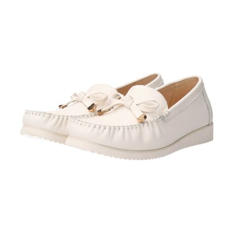 リボンモチーフがさりげなくフェミニンな印象のレザーモカシンは、アッパーが袋状に縫われていて返りが良く、フットベッド仕様で足当たりも良いです。