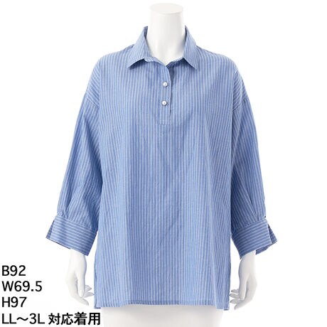[型番:59362]綿麻混先染めストライプ素材スキッパーチュニックデザインでパール調ボタン使い、