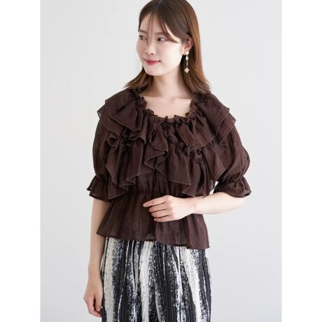 クロスするボリュームフリルの甘さが効いたブラウス。