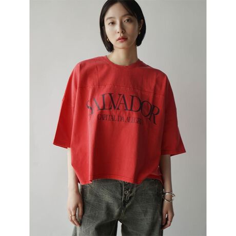 アーチ型のロゴがポイントのカジュアルなドルマンスリーブTシャツ。