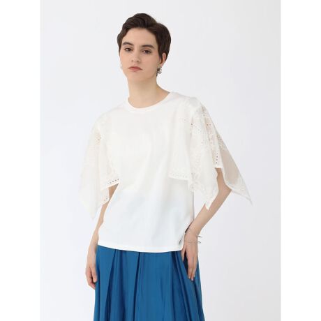 ワントーンの中に表情と奥行きを感じさせる、刺繍レースをあしらったカットソー。女性らしい印象ながらも甘さを控え、大人のデイリー巣地あるに馴染むAgaらしいデザインに。着回しの効くモノトーンカラーがこの夏重宝するデザインアイテムです。