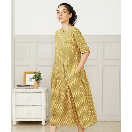 ホコモモラならではの鮮やかな配色ワンピースは一枚で映えること間違いなし。袖が長めなので安心してお召しいただけるのも嬉しいポイント。季節の変わり目にはカーディガンやジャケットを重ねてお召しください。