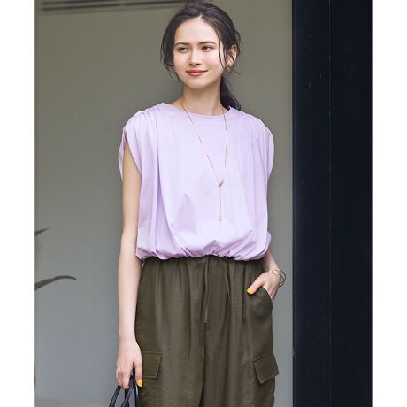 肩と裾に贅沢なギャザーを入れた コンパクトな丈のデザイントップスです。ウエストにポイントがあるボトムにも合わせやすく、インせずコーディネートを楽しめます。2枚仕立てですが薄い素材なのでエアリーで肌離れもよく、体のラインを拾いにくいのが特徴です。合わせやすく爽やかなホワイト系(#001)、シックで上品なネイビー系(#075)、優しい印象のライラック系(#082)の3色展開です