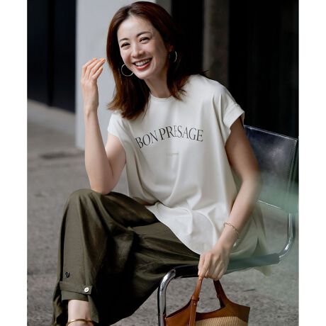 ロゴプリントがポイントのTシャツ。折り返し仕様のフレンチ袖とゆったりめなシルエットがリラックス感のあるデザインです。「BON-PRESAGE(吉兆)」のロゴプリントをあしらい、夏に向け楽しいイベントが増える季節に良いことが起こりそうな予感を表現しました。下段には箔プリントでシックな配色にさりげないきらめきを効かせ、軽やか(L?gerement)に幸運を呼び込むイメージのメッセージです。ロゴとシルエットがシンプルなコーデのアクセントにおすすめです。カラーは、ベーシックなホワイト(#001)、抜け感のあるライトグレー(#003)、ニュアンス感のあるグレー(#004)の3色展開です。ホワイトにはブラック、ライトグレーにはスレート、グレーにはライトベージュのカラーでロゴをあしらいました。