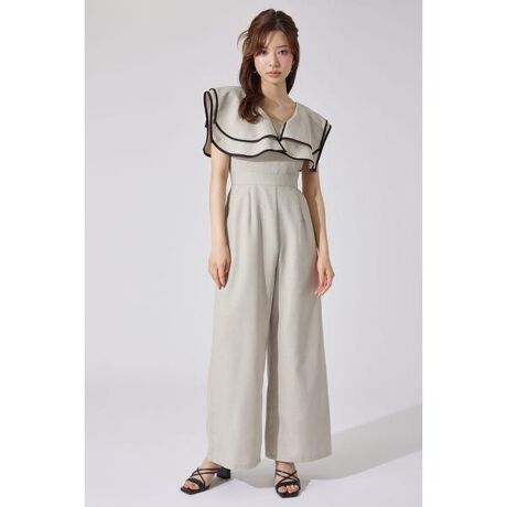 【ダブルフリルが可愛い、簡単にスタイルアップが叶うロンパース】■ポイント襟周りからショルダーに繋がるスクエア状のダブルフリルが大人フェミニンさを演出させるロンパース。フリルのサイズを大きく設定することで小顔効果や、二の腕も華奢見えするので女子には嬉しいポイント。■ディテール襟の裾には配色のパイピングを施したことでより存在感がアップ。腰位置を高くし、裾までストレートからワイドシルエットにすることでトレンドライクに仕上げ、誰でも簡単にスタイルアップが叶うロンパースにしました。■スタイリングデイリーユースからオケージョンまで幅広く着ていただけます。■生地透け感:なし裏 地:あり伸縮性:なし光沢感:無し厚 さ:中肉■商品のお気に入り登録お気に入りアイテムの再入荷・在庫1点などの通知を受け取ることができます。[注意事項]※画像の商品はサンプルです。実際の商品と仕様、加工が若干異なる場合があります。※画像の商品は光の照射や角度、お使いのモニター環境により、実物と色味が異なる場合がございます。※着用、お取り扱いの際は、アテンションタグをご確認ください。