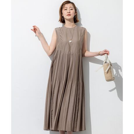 清楚な印象のプリーツをスカート部分に贅沢にあしらったワンピース。上品な艶感としなやかな落ち感のある素材で広がりすぎない上品なボリューム感、ウエスト位置を高くとることでスタイルよくみえるように仕上げています。キレイめにもカジュアルにも使いやすいシンプルなスリーブレスデザインで1枚でも品があり、羽織りアイテムも重ねやすいデザインです。カラーは、爽やかな青味を感じるダークグリーン(#065)、暑い時期にもカジュアルすぎず適度な品を感じるモカ(#034)、清楚な優雅さを引き立てる深みのあるネイビー(#075)の3色展開です。
