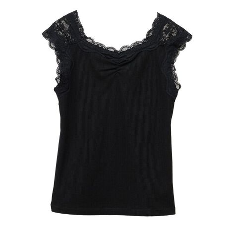 ラメ入りのテレコ素材で仕立てたタンクトップ。肩と脇・首回りにストレッチ性のあるレースを組み合わせ、上品で女性らしいデザインに仕上げました。胸元のさりげないギャザーが洒落感のあるポイント。ジャケットやシャツのインナーとしても活躍する汎用性の高いアイテムです。透け感[ややあり]